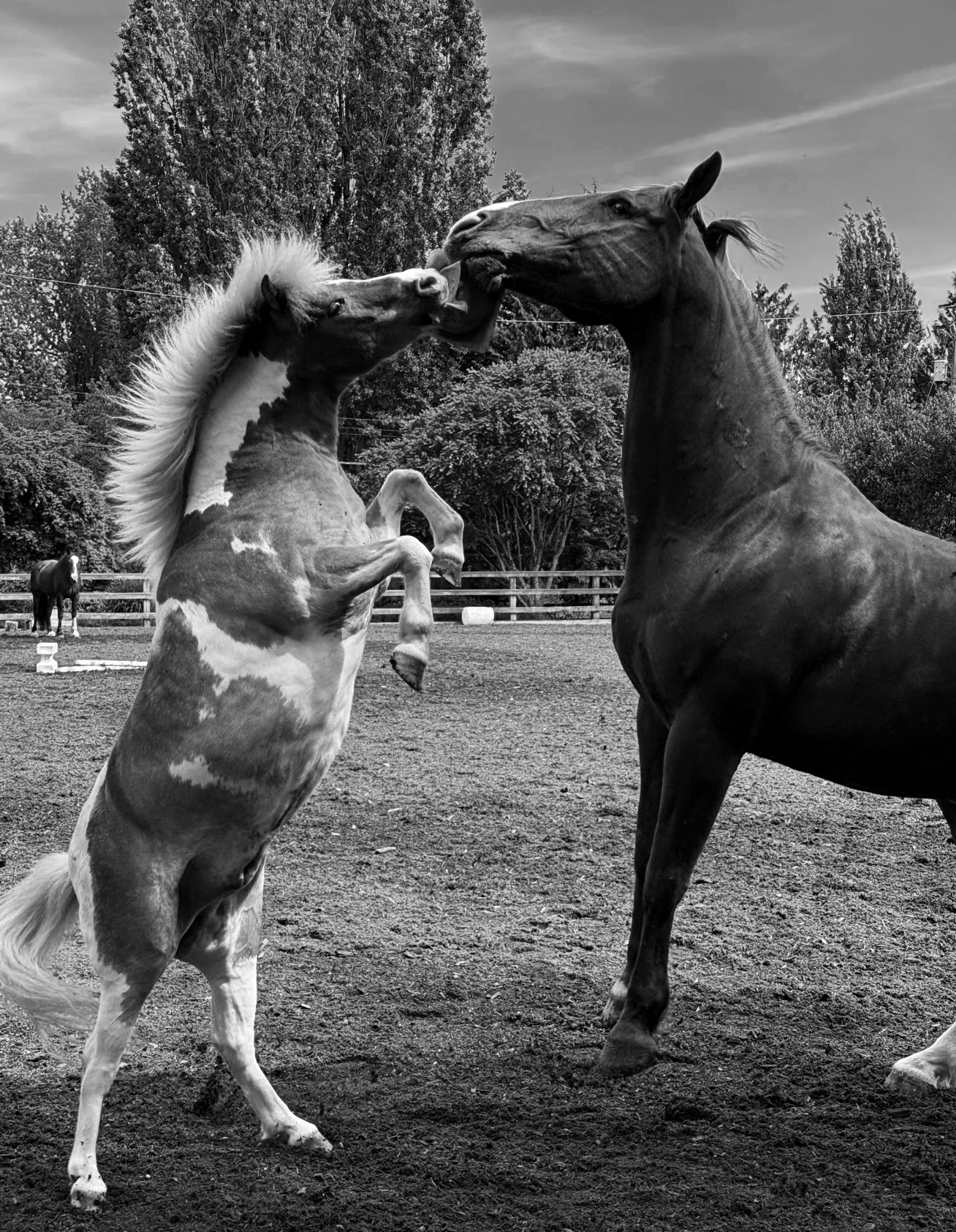 Wherever possible, we stable bonded horses adjacent to each other, allowing mutual grooming and social play through safe contact barriers. Mutual grooming is a natural stress-reducing behavior that releases endorphins and strengthens social bonds.